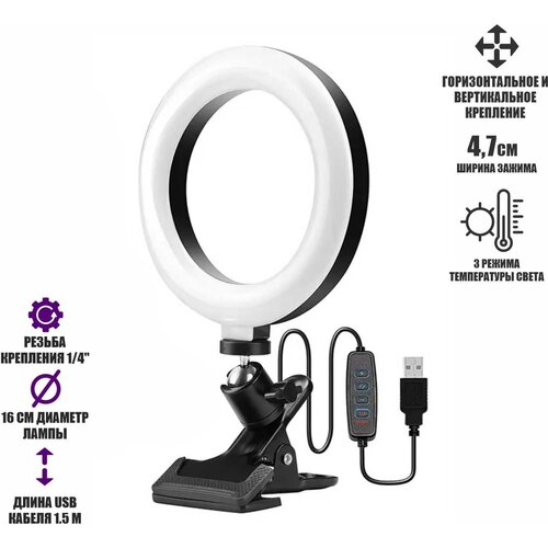 Кольцевая селфи лампа SH-116 на прищепке с шарниром, диаметр 16 см