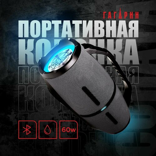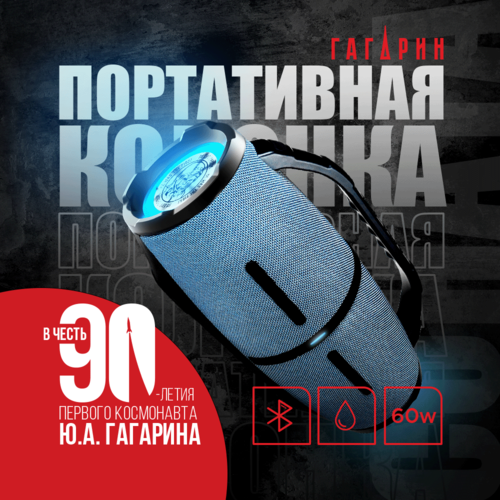 Портативная Bluetooth колонка Урал Гагарин ГР-007 синяя, водонепроницаемая IP67, 60 Вт Мощность, TWS, FM-радио, беспроводная