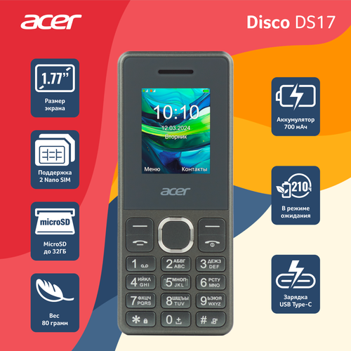 Телефон сотовый Acer Disco DS17, 2 Nano-SIM, 1.77", 700 мАч, Темный серый