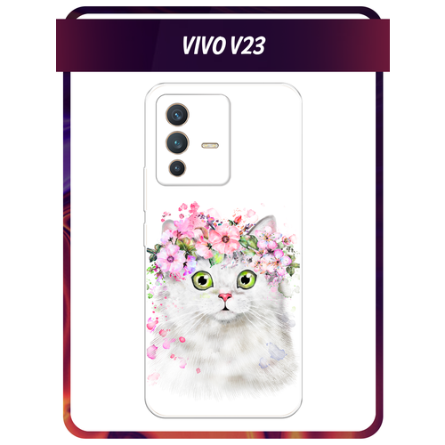 Чехол на Vivo V23 / Виво V23 с принтом Белая кошка с цветами