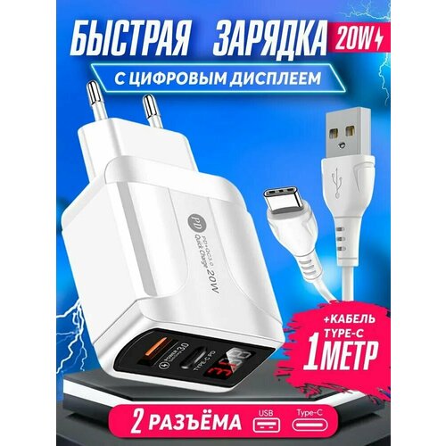 Зарядное устройство для телефона 1USB+PD20W с LED дисплеем, кабель TYPE-C 1 м, быстрая зарядка для iphone, samsung, honor, xiaomi, realme, белая