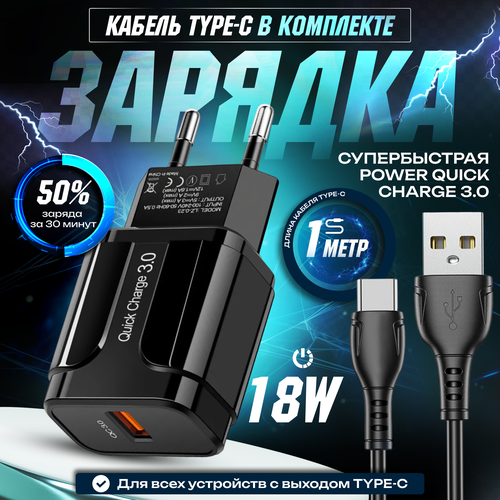 Сетевое зарядное устройство для телефона 18 Вт + USB 3.0 QC с кабелем TYPE-C 1 метр / Быстрая зарядка для мобильных устройств /