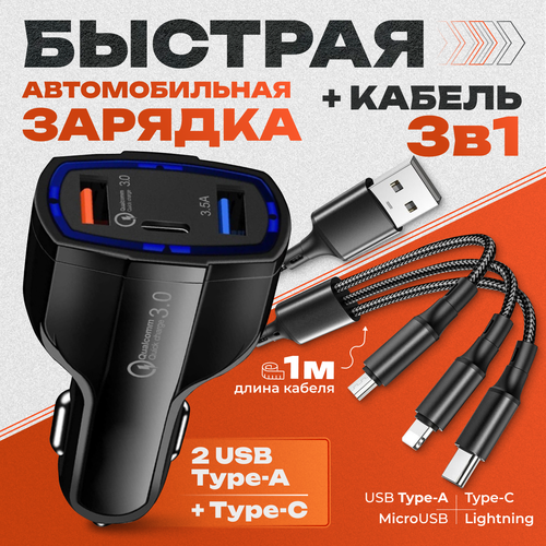 Автомобильное зарядное устройство + кабель 3в1 для телефона / Быстрая зарядка в прикуриватель QC3.0 2USB х 3.1 А + Type C PD / блок питания