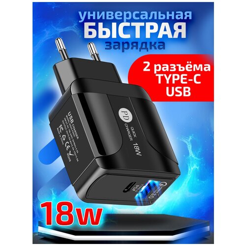 Сетевое зарядное устройство для телефона 18 Вт, 2 USB порта Type C PD + QC USB 3.0, быстрая зарядка для iphone, черная