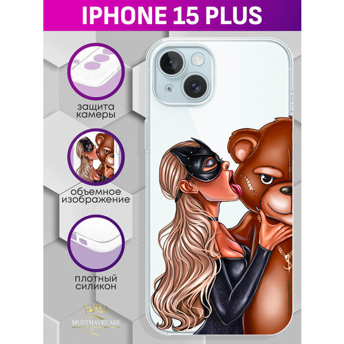 Чехол для смартфона iPhone 15 Plus прозрачный силиконовый Кошечка блондинка и мишка