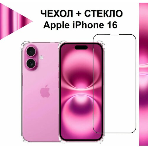 Комплект 2 в 1: Прозрачный чехол с защитой камеры и углов + полноэкранное стекло для Apple iPhone 16 / Айфон 16 Premium