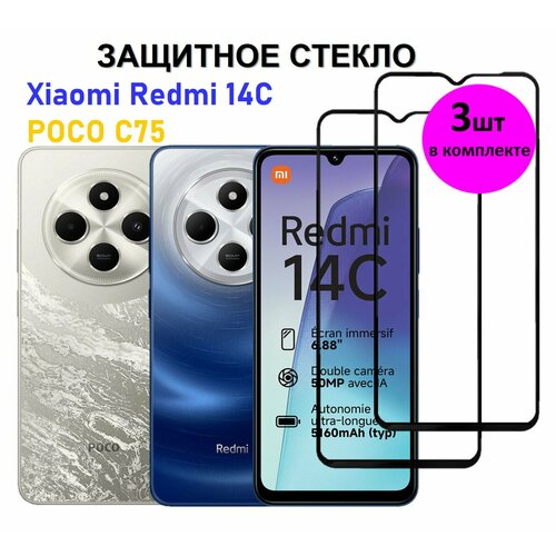 Комплект 3 в 1: Защитное стекло на Xiaomi Redmi 14C / POCO C75 ( 3 шт ) Ксяоми Редми 14Ц / Поко Ц75 Полноэкранное стекло с рамкой Full Glue