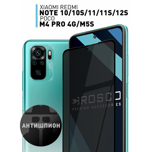 Защитное стекло антишпион на Xiaomi Redmi Note 10, Note 10S и Poco M5s (Сяоми Редми Ноут 10, 10с и Поко М5с), с эффектом приватности, чёрные рамки, бренд Rosco, 1 шт
