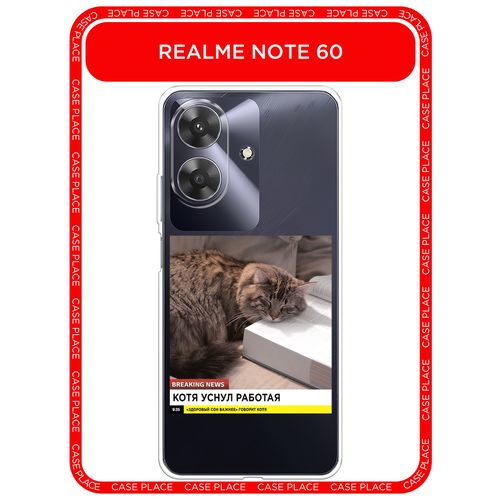 Чехол на Realme Note 60/60X / Реалми Нот 60/60X с принтом Кот уснул работая, прозрачный