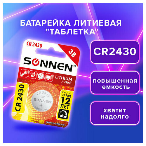 Батарейка литиевая CR2430 1 шт. "таблетка, дисковая, кнопочная" SONNEN Lithium, в блистере, 455600, 3 штуки