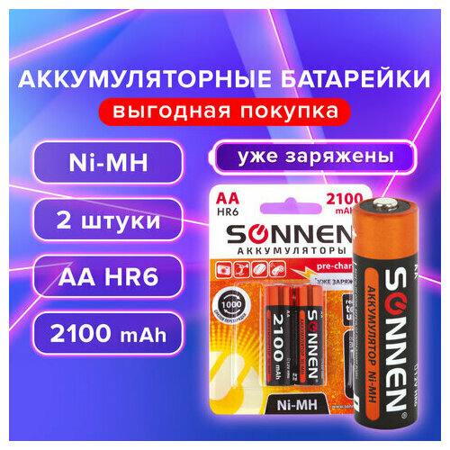 Батарейки аккумуляторные Ni-Mh пальчиковые комплект 2 шт, АА (HR6) 2100 mAh, SONNEN, 454234
