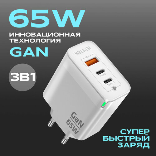 Зарядное устройство для телефона, WALKER, WH-45 GaN, 3.25А, 65Вт, USBx1/Type-Cx2, быстрая зарядка QC 3.0+PD, белое