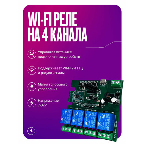 Умное реле WIFI+RF, контроллер на 4 канала без корпуса, 7-32В, умный дом