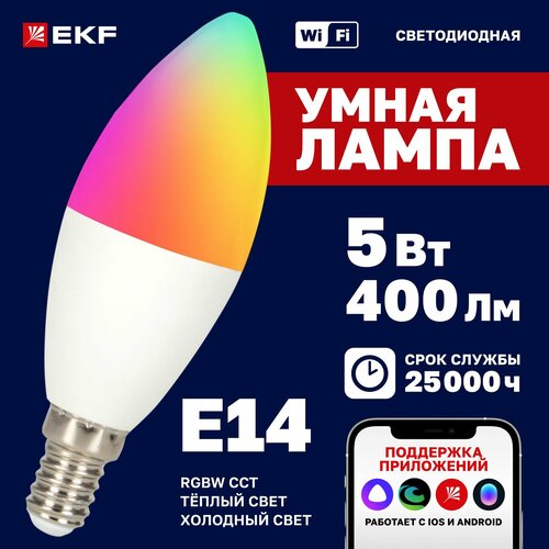 Умная светодиодная лампочка EKF Connect 5W RGB+W Е14 с Wi-Fi, Яндекс Алисой, Марусей, Салютом