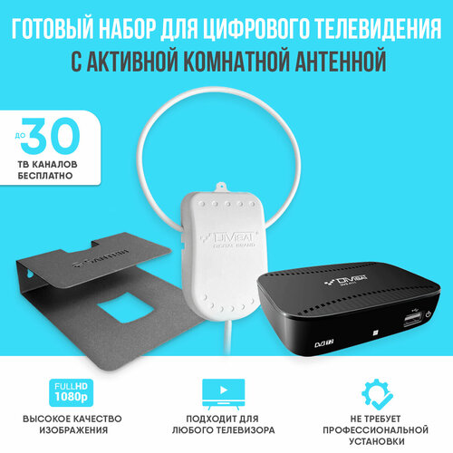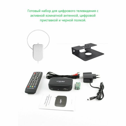Комплект цифрового ТВ с активной комнатной антенной, цифровой приставкой и черной полкой