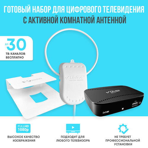 Комплект цифрового ТВ с активной комнатной антенной, цифровой приставкой и белой полкой