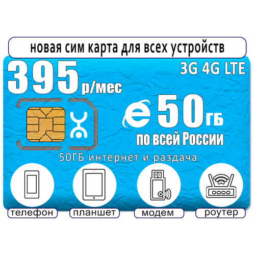 Сим карта с интернетом и раздачей по России, 50ГБ за 395р/мес