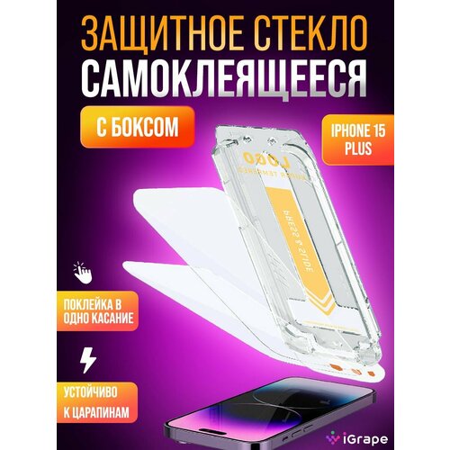 Защитное стекло самоклеящееся с боксом iPhone 15 Plus, iGrape (Прозрачное) / стекло на айфон 15 плюс