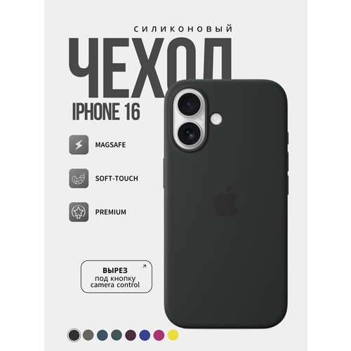 Чехол силиконовый для iPhone 16, с поддержкой беспроводной зарядки, Soft touch, цвет черный