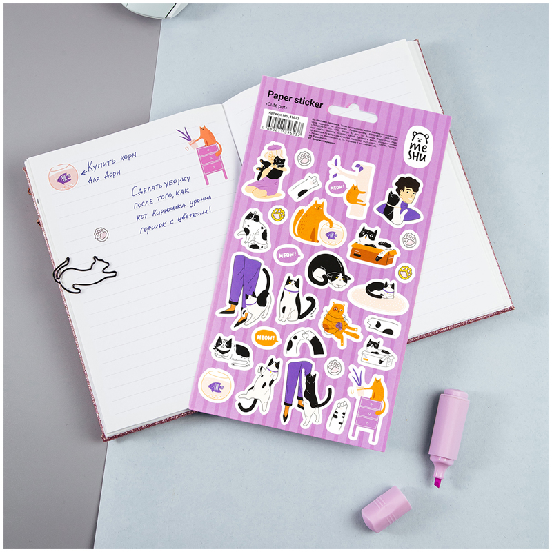 Наклейки бумажные для ежедневников MESHU Right cat 12*21см 77 наклеек европодвес (10шт) 100058555664