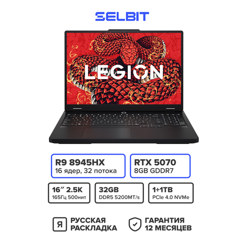 Игровой ноутбук Lenovo Legion R7000P 2025, AMD Ryzen 9 8945HX, RTX 5070, RAM 32ГБ, SSD 1+1ТБ, Черный