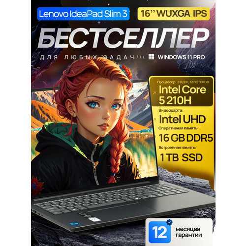 16" Ноутбук Lenovo IdeaPad Slim 3i Gen 10, IPS WUXGA, Intel Core 5 210H (4.8 ГГц), RAM 16 ГБ LPDDR5 (4800 Mhz), SSD 2 ТБ, Intel UHD Graphics, Windows 11 Pro + Microsoft Office 2021, Grey, Русская раскладка, Металлическая крышка