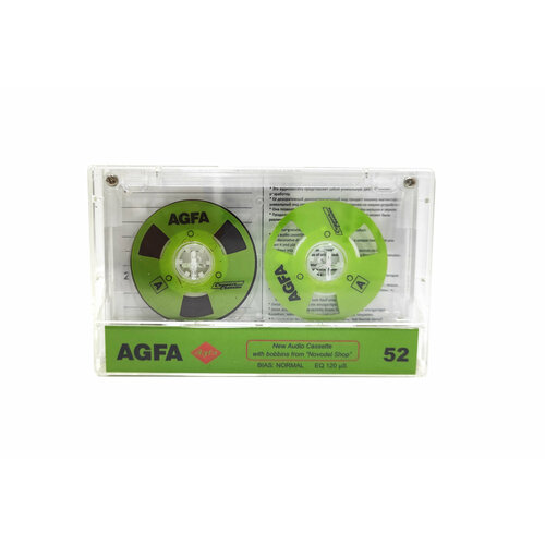 Аудиокассета "AGFA" с серебристыми боббинками в чёрно-прозрачном корпусе