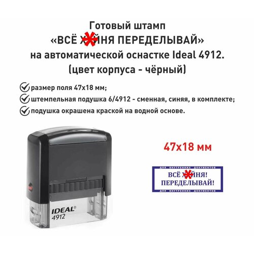 черныйАвтоматический штамп "получено" с датой - Готовый штамп с текстовым клише, изготовленным из резины, методом лазерной гравировки на автоматической оснастке IDEAL 4911, с размером поля 38х14 мм. Оттиск синего цвета, корпус оснастки черного цвета.