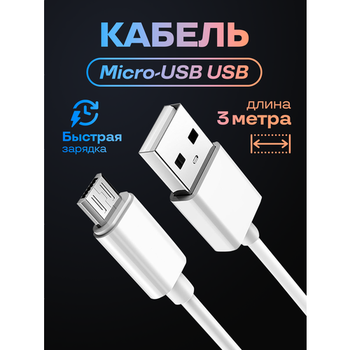 Кабель Micro USB / USB для зарядки мобильных устройств / 3 метра / Провод телефона, планшета, наушников с разъемом Микро ЮСБ / Шнур для зарядки, Белый