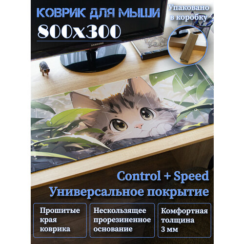 Коврик для мыши 800х300х3. Котик в листьях под дождем
