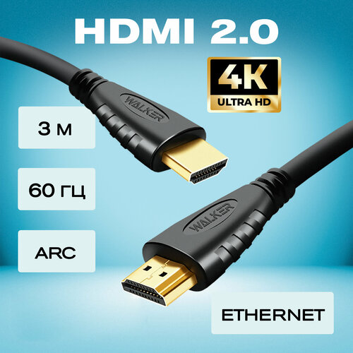 HDMI кабель, WALKER, WHD-33, 3 м, поддержка 4К, провод hdmi, шнур на телевизор, ugreen, baseus, переходник, патч корд, переходник hdmi vga