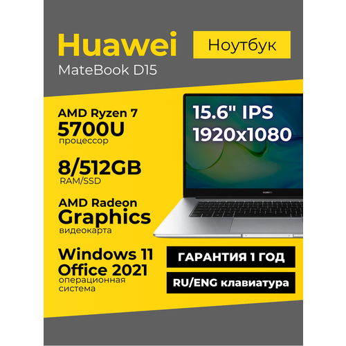 Ноутбук Huawei MateBook D15 15.6 IPS FHD Ryzen 7 5700U 8ГБ 512ГБ AMD Radeon Graphics Космический серый Windows 11+Office