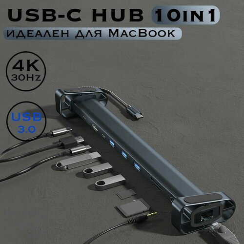USB HUB 3.0 док-станция для ноутбука 10in1 / Type-C HDMI HUB для MacBook / USB Разветвитель с HDMI 4K 30 Гц, RJ-45 100 Мбит/С, USB 3.0x3, PowerDelivery 100W
