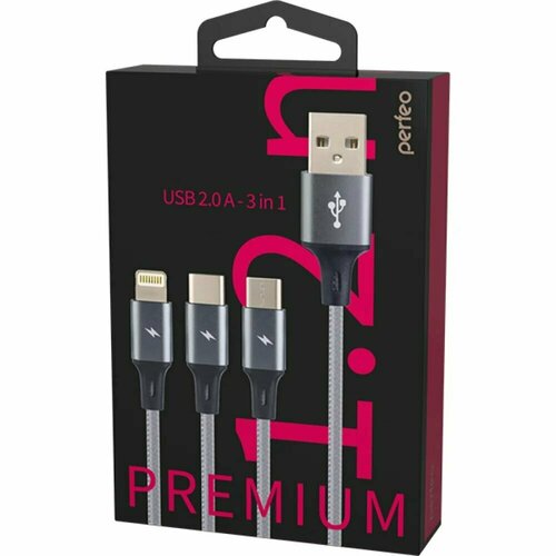 PERFEO, Кабель USB2.0 A вилка - 3 в 1 (Micro + Type C + 8 PIN вилка), серый, 1,2 метра