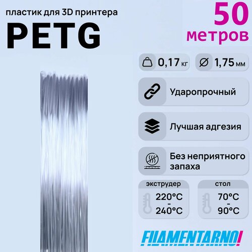 PETg прозрачный моток 50 м, 1,75 мм, пластик Filamentarno для 3D-принтера