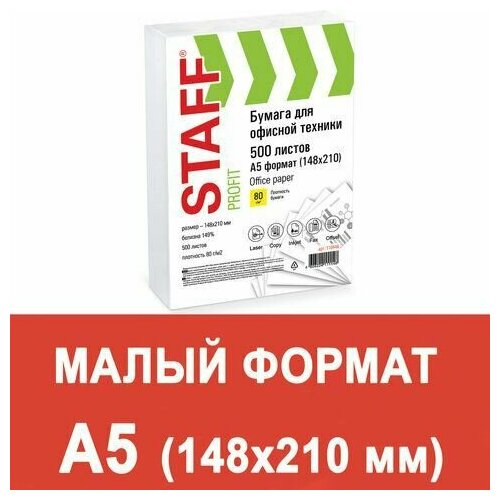 Бумага офисная малого формата (148х210), А5, 80 г/м2, 500 л, марка С, STAFF "Profit", 149% (CIE)
