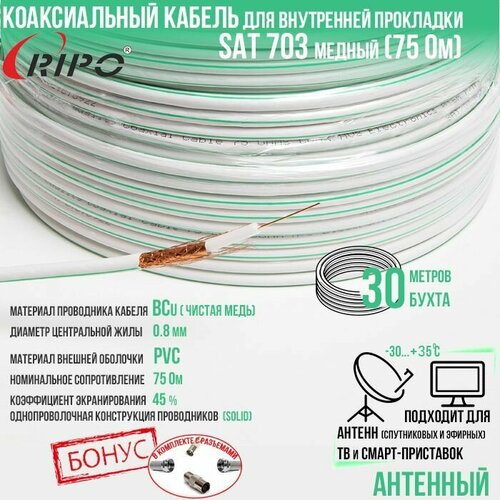 Антенный медный коаксиальный (телевизионный) кабель SAT-703 indoor внутренний белый для передачи видео, 30 метров