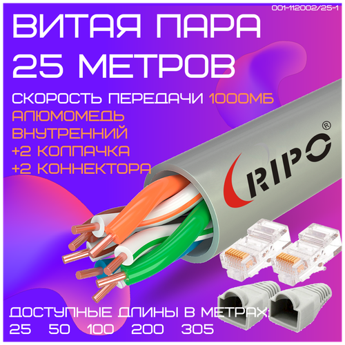 Кабель витая пара 25 м провод для интернета, 2 коннектора rj45, 2 колпачка, сборный патч корд LAN UTP4 CAT5E 24AWG CCA RIPO 25 метров 001-112002/25-1
