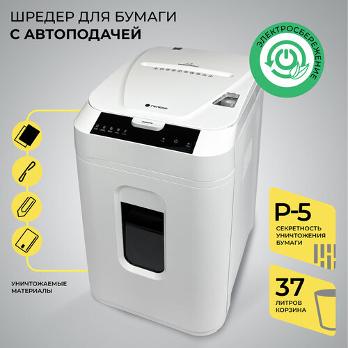Шредер для бумаги, скобы, скрепок, пластиковых карт c автоподатчиком гелеос АП40-5, корзина 37 л, уровень секретности P-5