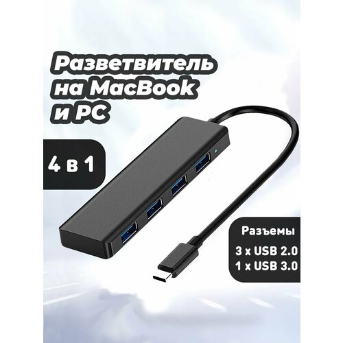 Переходник для Macbook и ноутбука usb Hub 4 в 1 длина 12 см, черный адаптер
