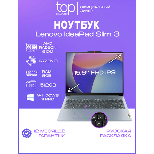 15.6" Ноутбук Lenovo IdeaPad Slim 3i, IPS, AMD Ryzen 5 7430U (4.3 ГГц), RAM 16 ГБ, SSD 1 TБ, AMD Radeon RX Vega 7, Windows 11 Pro + Office 2021 Pro Plus, Русская раскладка