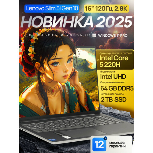 16" Ноутбук Lenovo IdeaPad Slim 5i Gen 10, 2.8K OLED, 120 Гц, 130% sRGB, Intel Core 5 220H (12 Ядер, 4.9 ГГц), RAM 64 ГБ LPDDR5, SSD 2 ТБ, Intel UHD Graphics, Windows 11 Pro + Microsoft Office 2021 Pro Plus, Металл, Русская раскладка