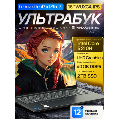 16" Ноутбук Lenovo IdeaPad Slim 3i Gen 10, IPS WUXGA, Intel Core 5 210H (4.8 ГГц), RAM 40 ГБ LPDDR5 (4800 Mhz), SSD 2 ТБ, Intel UHD Graphics, Windows 11 Pro + Microsoft Office 2021, Grey, Русская раскладка, Металлическая крышка