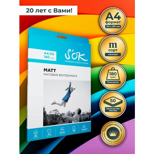 Фотобумага A4 матовая, плотность 180 гр, 50 листов, SOK