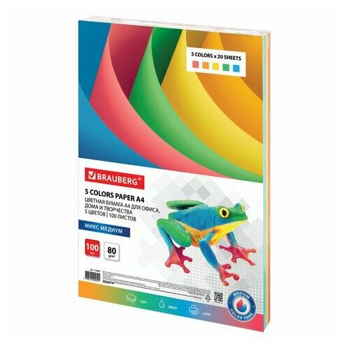 Бумага цветная BRAUBERG, А4, 80 г/м2, 100 л, (5 цветов х 20 л.), медиум, для офисной техники, 112462