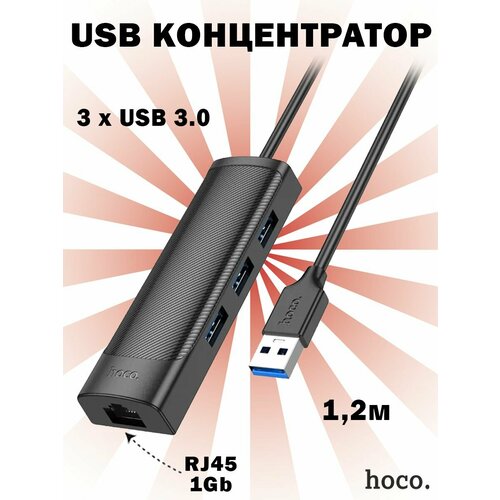 Переходник Hoco HB42 USB концентратор 4 в 1 Gigabit Ethernet Adapter USB to USB 3.0 х 3 + RJ45, 1.2М