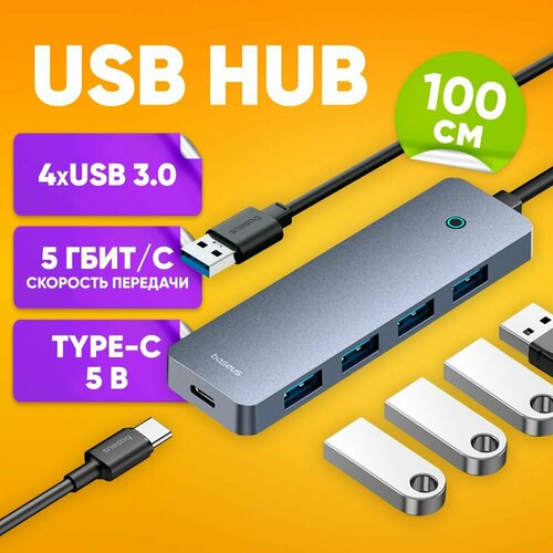 USB Hub Baseus, серебристый, 100 см / USB-концентратор USB 3.0 х 4 шт. + Type-C / HUB разветвитель / USB- ХАБ для периферийных устройств