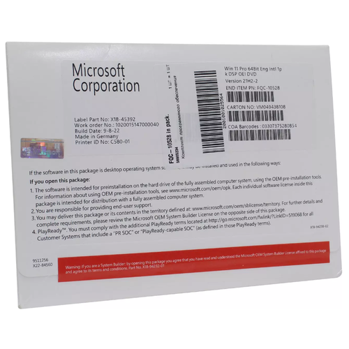 Microsoft Windows 11 Pro для Windows, лицензия и диск, английский, количество пользователей/устройств 1 устройство, бессрочная