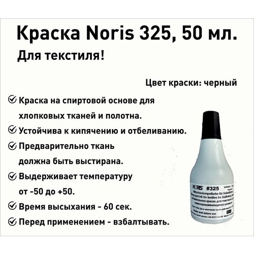 Noris 196 - Быстросохнущая штемпельная краска, штемпельные чернила на спиртовой основе для полиэтилена и полипропилена. Светопроницаемая. Дает устойчивый оттиск. Используется со специальными штемпельными подушками для спиртовых красок. Легко воспламеняемая. Время высыхания: 11 сек. Перед применением - взбалтывать.