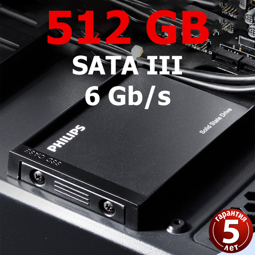 SATA SSD, Philips, 512ГБ, скорость чтения 500 МБ/с, скорость записи 480 МБ/с.